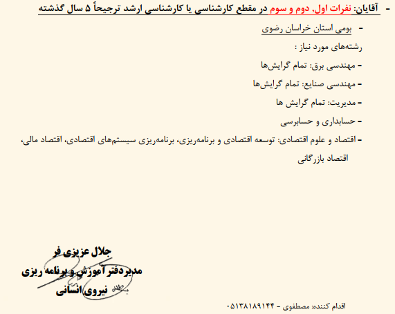 شرکت توزیع نیروی برق استان خراسان رضوی برای تأمین نیروی انسانی متخصص مورد نیاز خود فارغ التحصیلان ممتاز دانشگاهی (به شرح تصویر) را بدون برگزاری آزمون و پس از برگزاری مصاحبه عمومی استخدام می نماید.
