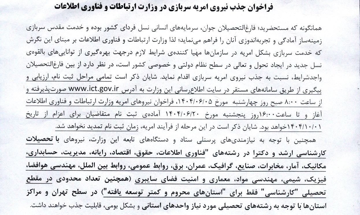 برای دریافت اطلاعیه فراخوان جذب نیروی امریه سربازی در وزارت ارتباطات وفناوری اطلاعات کلیک کنید.